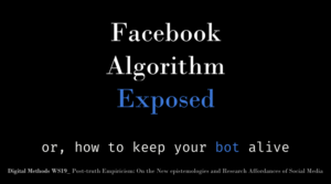 Between the 7th and 11th of January, Claudio Agosti, Davide Beraldo and Jeroen de Vos from the ALEX / DATACTIVE team took part in the annual Digital Methods Initiative’s Winter School. This was the perfect occasion to kick-off a project related to the development and application of facebook.tracking.exposed, a browser extension developed in order to … Continue reading ALEX @DMI winterschool